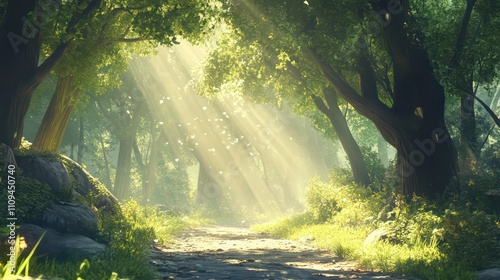 Sunbeams illuminate a path through a lush, green forest with dappled light and mossy rocks.