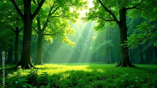forest, tree, sunlight, sunbeam, green, nature, wood, timberland, peaceful, serene, calm, tranquil, lush, vibrant, foliage, leaf, grass, meadow, landscape, environment, ecology, spring