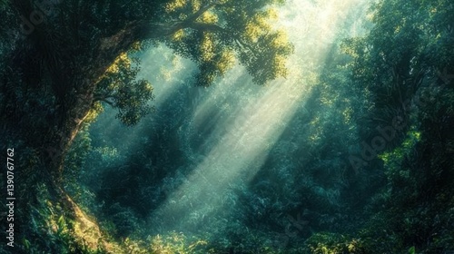 Sunbeams illuminate mystical forest; ancient tree, nature background, fantasy setting