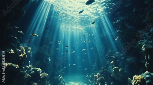 ocean, underwater, sea, coral, reef, fish, sunlight, sunbeam, ray, water, blue, marin, life, nature, wildlife, aquatic, ecosystem, environment, depth, dark, light, beauty, scene, background, vibrant, colourful, tropical, exotic, ocean floor, fish, swimming, school, sun