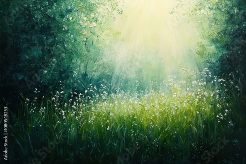 sunlight, sunbeam, forest, clearing, meadow, field, grass, green, leaf, branch, tree, foliage, nature, landscape, wild, wildflower, white, flower, summer, spring, painting, art, oil, canvas, vibrant, tranquil, serene, peaceful, beauty, natural, magical, dreamy, aethereal, mystical