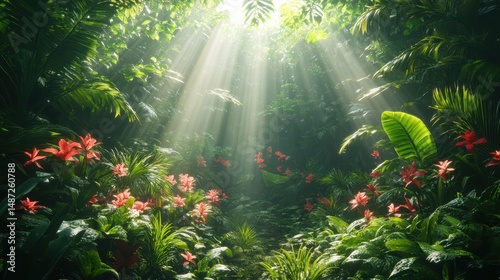 Sunbeams in lush rainforest, vibrant flowers, tranquil scene, nature background, ideal for travel brochures