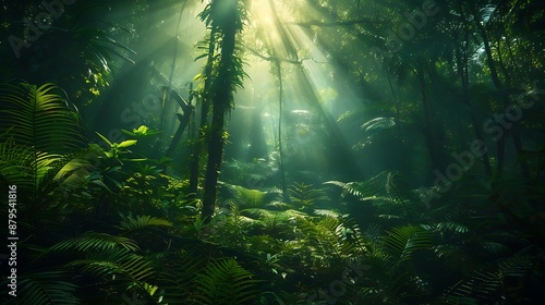 rainforest, jungle, tropical, green, sun, light, sunbeam, foliage, leaf, forest, tree, plant, nature, vegetation, lush, dense, shadow, dark, bright, ray, beam, mist, fog, haze, humidity, canopy, underbrush, ground, path, trail, wild, untamed, exotic, vibrant, life, growth, morning, day, wildlife, photo, photo