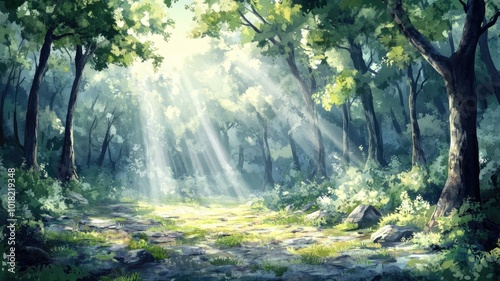 forest, sunlight, tree, green, leaf, canopy, branch, wood, path, light, sunbeam, ray, shadow, foliage, nature, landscape, scene, pathway, mossy, stone, rock, ground, overgrown, lush, vibrant, mystical, serene, calmness, peace, beauty, peaceful, magical, aethereal