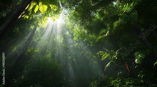 Sunbeams Through Dense Tropical Rainforest Canopy