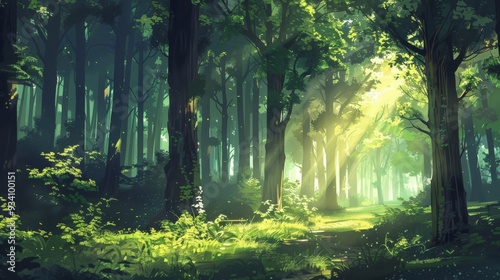forest, tree, sunlight, sunbeam, green, nature, timberland, wood, foliage, pathway, path, summer, spring, morning, landscape, green leaf, bright, high-coloured, peaceful, serene, calm, calmness, beauty, natural, fresh, fresh air, shadow, light, dark, deep, dense, mystery, fantasy, enchanted forest, illustration, digital artwork, artwork, painting, art, artistic, tree, sun, mist, fog