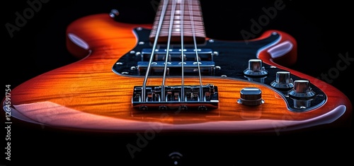 bass, guitar, music, instrument, sunburst, string, fretboard, wood, body, neck, headstock, tuning, peg, control, knob, pickup, bridge, hardware, glossy, polished, texture, detail, closeup, macro, photo, musical, instrumentation, rythm, melody, harmony, sound, tone, vibrant, orange, brown, red, black, dark, background, studio, professional