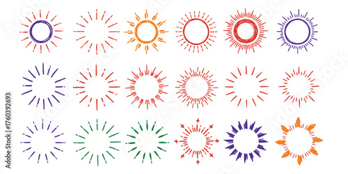 sunburst, starburst, vector, burst, explosion, sun, ray, geometric, graphic, element, collection, pack, retro, vintage, badge, label, frame, circle, shape, radial, spark, fireworks, light, effect, simple, illustration, logotype, banner, energy, abstract, drawing, outline, colourful, red, orange, blue, purple, green, yellow, design, isolated, creative, promo, sale
