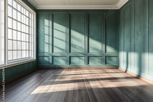 room, interior, design, teal, paneling, light, shadow, wood, floor, window, sunlight, empty, roomy, classic, elegant, modern, corner, home, green, wooden, bright, sunbeam, decorative, beautiful, colourful, creative, stylish, professional, vibrant, stunning, amazing, marvellously, fantastic, gorgeous, lovely, charming, attractive, impressive
