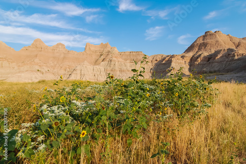 badlands national park, grass-land, landscape, blue skies, geologic, morning light, mountain, nature, outdoors, scenic, sunflower, tour tourism, travel