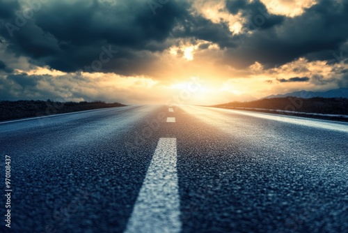 Sunlight blurs asphalt road on horizon with dark cloudy sky