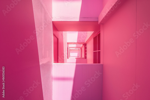 pink, building, facades, geometric, shape, sunlight, architecture, abstract, design, modern, colours, pattern, light, shadow, perspective, line, symmetry, urban, city, exterior, wall, window, door, nobody, empty, minimalism, minimal, graphic, vibrant, saturated, surreal, contemporary, art