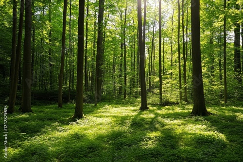 forest, sunlight, tree, green, nature, wood, scenic, tranquil, peaceful, serene, environment, beautiful, timberland, hiking, biodiversity, conservation, ecosystem, deciduous, natural beauty, photosynthesis, lush, vibrant, tall trees, underbrush, foliage, canopy, forest floor, spring, summer, freshness, renewal, growth, verdant, sustainability