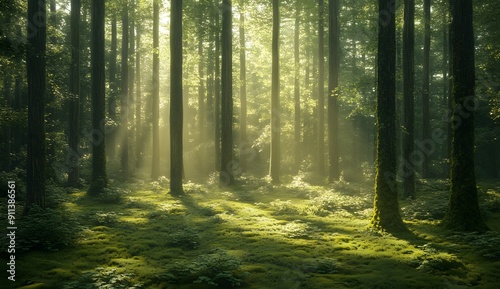 sunlight, filtering, through, tall, tree, ancient, forest, creating, dappled, light, lush, green, moss-covered, ground, nature, serene, peaceful, tranquil, timberland, mystical, foliage, outdoors, scenic, picturesque, shaded, natural, atmosphere, environmentally friendly, organic, untouched, environment, pristine, canopy