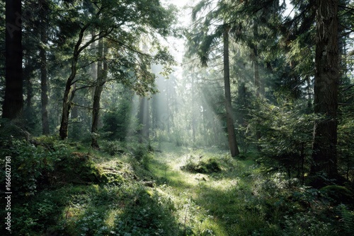 Sunlight filters through trees in a serene green forest, illuminating lush undergrowth and creating a tranquil atmosphere at midday in nature