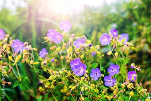 Sunlight on bright purple flowers of meadow geranium among green grass