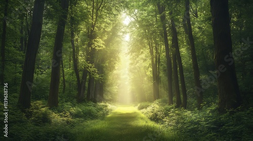 Sunlight Path in a Mystical Forest. Concept of peace, tranquility, and nature.