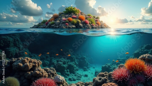 Sunlight shining over a vibrant coral reef with colorful sea anemones underwater