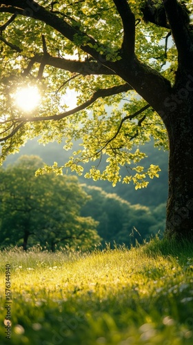 tree, shining, sunlight, tree branch, grassy, hillside, grass, green, plant, sun, leaf, trunk, growing, illuminating, light, scenic, natural, environment, day, summer, spring, warm, nature, landscape, meadow, field, flora, horizon, vegetation, rural, backlit, sunbeam, timberland, wood, hill, park, tranquil, calm, peaceful, fresh, seasonal, countryside, botany, sunny, daylight, foliage, golden hour, morning