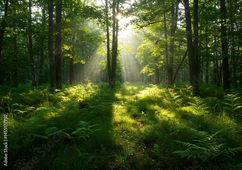 Sunlight Streaming Through Forest Trees, Nature Landscape, Greenery, Woods, Ecosystem Scene.
