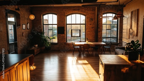 loft, interior, sunlight, brick, window, dining, kitchen, modern, design, home, apartment, living, space, open, industrial, rustic, warm, comfortable, cosy, decor, furniture, table, chair, plant, natural light, wood, floor, arch, view, urban, city, contemporary, living room, warmth, bright, daylight, elegant, stylish