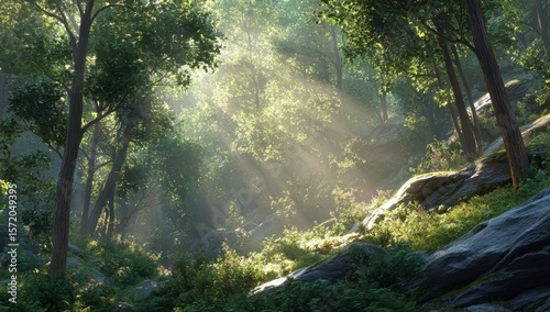 sunlight, forest, tree, misty, rock, nature, lush, green, plant, scenic, tranquil, vibrant, morning, wood, landscape, daylight, path, vale, foliage, vegetation, stone, moss, flower, growth, beauty, calm, peaceful, environment, illuminated, deep, mist, fresh, sparkling, bright, high-coloured, natural