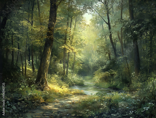forest, tree, sunlight, stream, creek, water, green, leaf, canopy, nature, landscape, scenery, timberland, wood, path, trail, peaceful, tranquil, serene, calm, quiet, beauty, outdoors, wilderness, wild, natural, environment, ecosystem, fresh