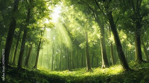 forest, tree, sunlight, green, canopy, wood, nature, landscape, light, foliage, environment, scenery, plant, vegetation, outdoors, tranquil, peaceful, serene, sunbeam, lush