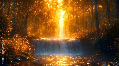 forest, waterfall, sunlight, tree, water, nature, light, gold, autumn, leaf, stream, bright, serene, peaceful, glow, cascade, wood, dappled, aethereal, illuminated, sparkle, branch, foliage, tranquil, wet, flow, vibrant, lush, gold, outdoors, beauty, landscape, environment, natural, scenic, glistening, timberland, picturesque, season, view, atmosphere, heaven, shimmer, dawn, dusk, magic, idylli