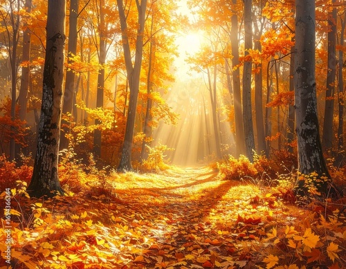 Sunlit Autumn Forest Path A Warm Golden Glow Through Trees and Fallen Leaves