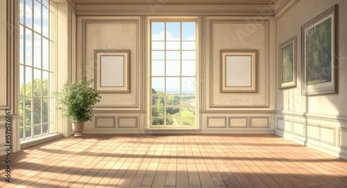 room, sunlight, window, panoramic, elegant, classic, vintage, interior, empty, art, frame, plant, pot, wood, floor, pale, beige, gold, ornate, decor, view, landscape, garden, tree, sky, light, bright, still, calm, peaceful, luxury, grand, large, high, wall, pane, design, home, space, empty space, perspective, realistic, digital, rendering