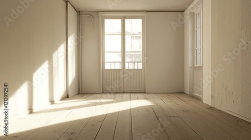 room, empty, interior, apartment, house, home, space, sunlight, sun, light, window, door, french, wooden, floor, floor, wood, wall, white, blank, clean, bright, airy, minimalist, design, architecture, building, real, estate, property, renovation, modern, vintage, rustic, simple, calm, peaceful, serene, quiet, roomy, comfortable, cosy, warm, natural, shadow, beam