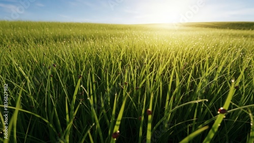 Sunlit field of fresh green grass with a gentle sun flare in the background, evoking a sense of peace and natural beauty