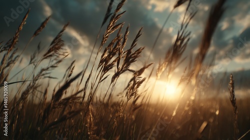 Sunlit Field of Tall Grass Under Dramatic Sky at Sunset with Cloudy Atmosphere and Warm Color Palette