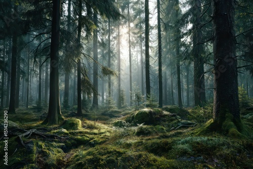 Sunlit Forest: Atmospheric Scene of Tall Trees and Mossy Ground