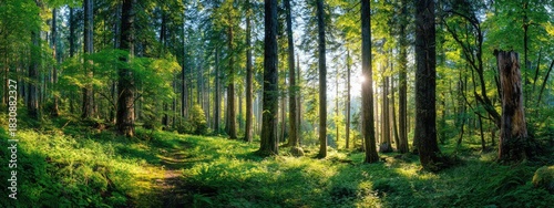 forest, tree, sunlight, nature, green, lush, path, plant, wood, outdoors, scenic, tranquil, forestry, landscape, pathway, natural, growth, ecology, environment, flora, vegetation, hiking, calm, calmness, wild, fresh, vital, abundant, healthy, untouched, majestic, beauty, peace