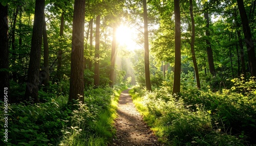 Sunlit Forest Path Natures Serene Journey with Sunshine Through Trees, and Outdoor Hiking.