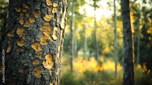 Sunlit forest with close-up of patterned tree bark adding texture and depth