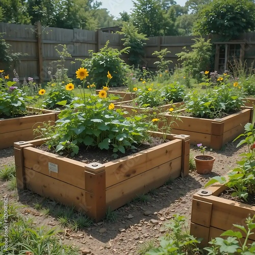 Sunlit Garden: Vibrant Yellow Flowers in Rustic Wooden Planters