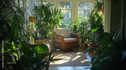Sunlit Indoor Garden with Wicker Chair and Lush Greenery