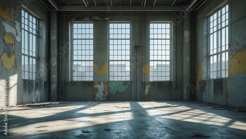 industrial, loft, warehouse, abandoned, empty, room, interior, space, building, architecture, window, large, tall, grid, natural, light, sunlight, sunbeam, shadow, and, concrete, floor, wall, textured, distressed, weathered, grimy, raw, minimalist, modern, urban, city landscape, view, daylight, bright, open, renovation, construction, studio, gallery, background, setting, scene, sunlit, vintage, retro