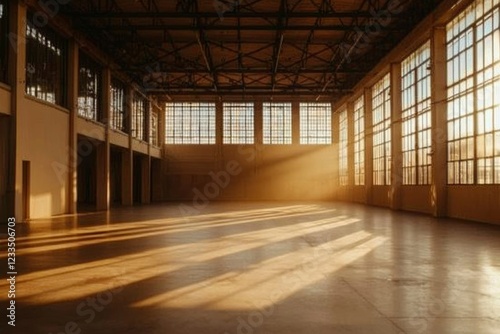warehouse, industrial, interior, space, design, sunlit, sunlight, window, large, pane, glasses, light, beam, shadow, floor, concrete, wall, building, architecture, structure, empty, huge, room, roomy, airy, open, bright, gold, hue, warm, tone, texture, line, perspective, depth, atmosphere, ambience, scene, setting, photo, image, picture, background