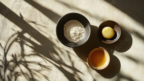 Sunlit ingredients in bowls: Flour, potato, and oil, ready for cooking on textured surface