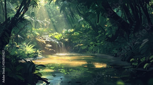 jungle, rainforest, forest, stream, water, waterfall, sun, sunlight, light, leaf, plant, green, nature, tropical, landscape, scenery, background, environment, ecology, vegetation, tree, creek, river, pool, sunbeam, shadow, lush, growth, wild, paradise, exotic, vibrant, calm, peaceful, serenity, hidden, mystery, adventure, exploration, path, journey, discovery, fresh, clear, wet