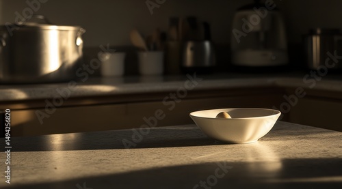 kitchen, counter, bowl, garlic, white, sunlit, sunlight, shadow, light, dark, background, blurred, item, cooking, food, clove, single, ceramic, morning, afternoon, domestic, home, interior, space, utensil, pot, pan, wooden, tool, appliance, elegance, minimalist, simple, clean, calm, quiet, serene, warm, cosy, soft, mellow, sepia, tone, grain, texture, surface, perspective, angle