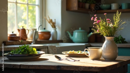 kitchen, table, wooden, rustic, sunlight, sunbeam, herb, flower, vase, wildflower, meal, food, breakfast, lunch, dinner, teacup, spoon, ceramic, pottery, simple, elegant, calm, peaceful, home, cosy