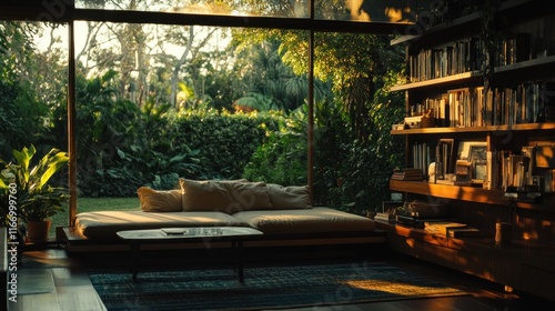 room, window, garden, sunlight, couch, pillow, bookshelf, book, plant, green, nature, home, interior, design, house, living, space, comfortable, relaxing, peaceful, serene, calm, tranquil, cosy, warm, light, shadow, furniture, modern, style, luxury, elegant, beautiful, aesthetic, architecture, landscape, view, indoor, lifestyle, comfort, day, sun, bright, afternoon, evening, floor, rug, table