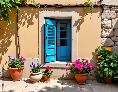 Sunlit Mediterranean Courtyard with Rustic Blue Window Shutter