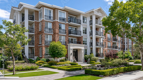 Sunlit mid-rise property with warm red brick tones, beige trim, and large balconies casting patterned shadows on green lawns, surrounded by decorative hedges beneath a cloudless bl