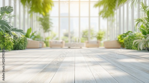 Sunlit Modern Lobby with Lush Greenery and Wooden Floor - Perfect for Product Placement